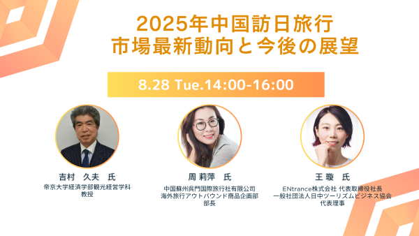 2025年9月2日 2025年 8月 2025年中国訪日旅行市場最新動向と今後の展望 帝京大学経済学部観光経営学科 教授 吉村 久夫氏 :講演資料ダウンロードはこちらから 中国蘇州呉門国際旅行社有限公司 海外旅行アウトバウンド商品企画部 部長 周 莉萍氏 :講演資料ダウンロードはこちらから 前後の記事へのリンク 前の記事 - 2025年 9月次の記事 - 2025年 10月